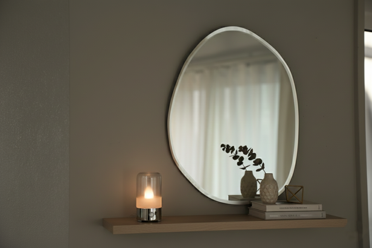 壁にかけるだけで、お部屋に視覚的な広がりと景色が生まれます。窓からの光や照明を反射し、空間全体を明るくする演出効果も抜群です。